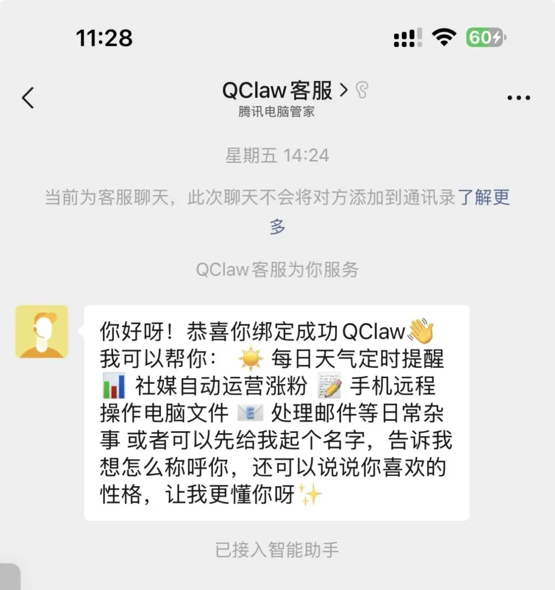 更新日志显示QClaw可以不再通过客服号的形式集成到微信了,而是直接以聊天卡片的形式,然后我去试了一下绑定微信。