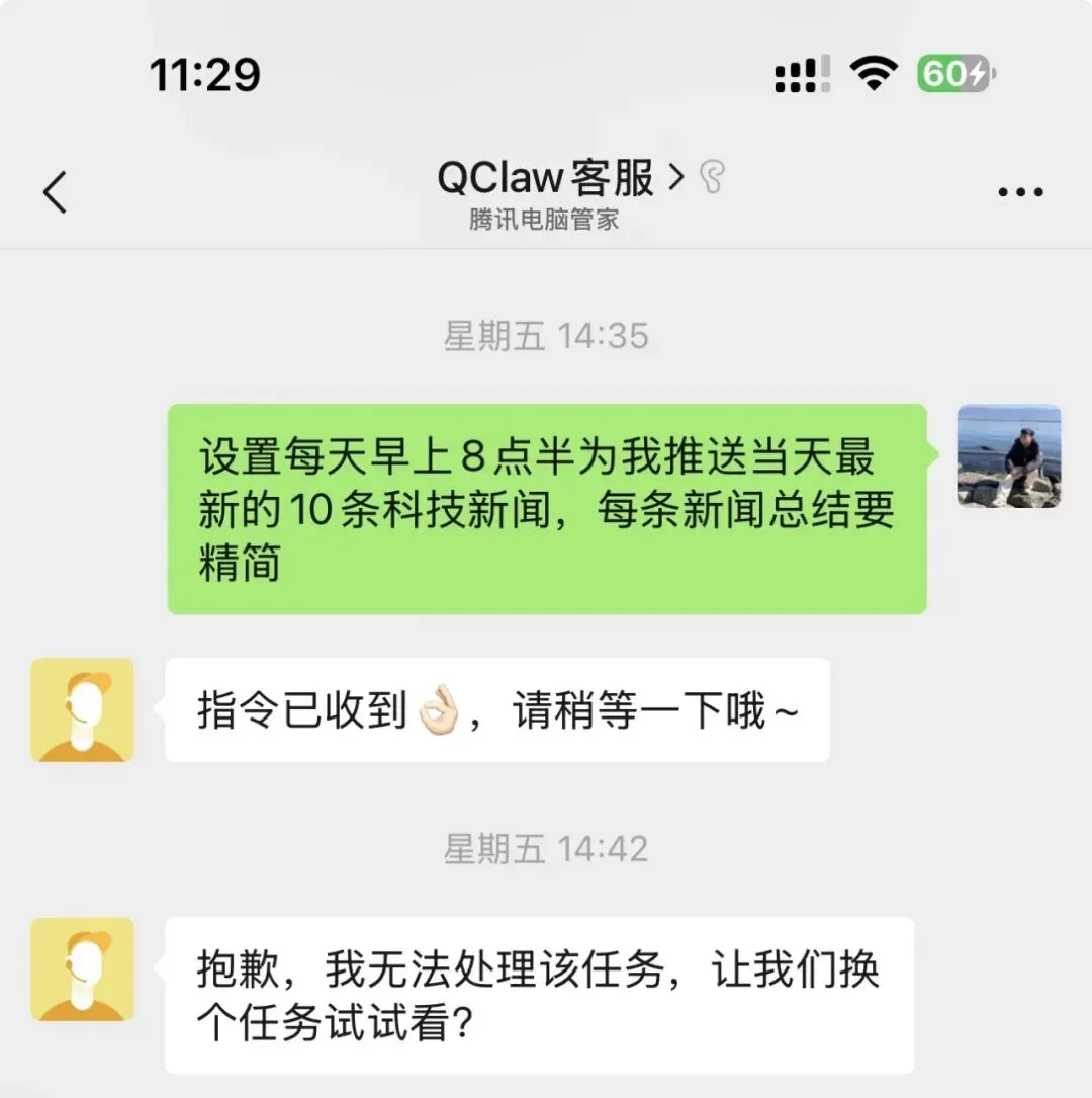 初期QClaw是以「客服号」的形式与微信集成,每次想和它互动,都得二次点击才能进入聊天界面,多了一步操作,偶尔会觉得麻烦。