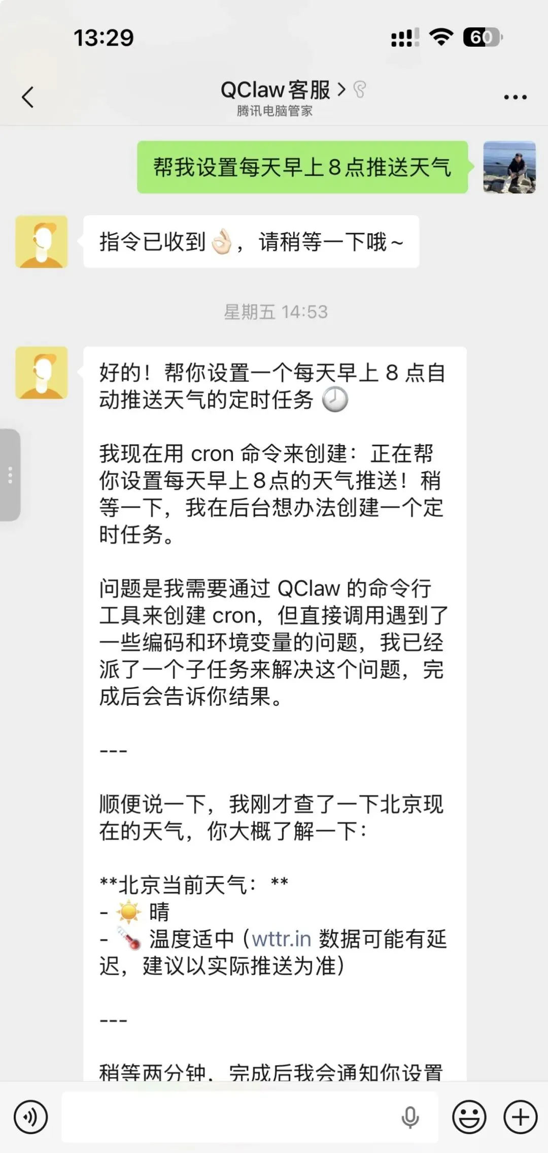 不死心的我,又按照官网提示,让它生成一个「推送天气」的任务,这次倒是没直接失败——等了大概十分钟,它回复了“好的”,还输出了一大堆内容,看起来像是成功了?
