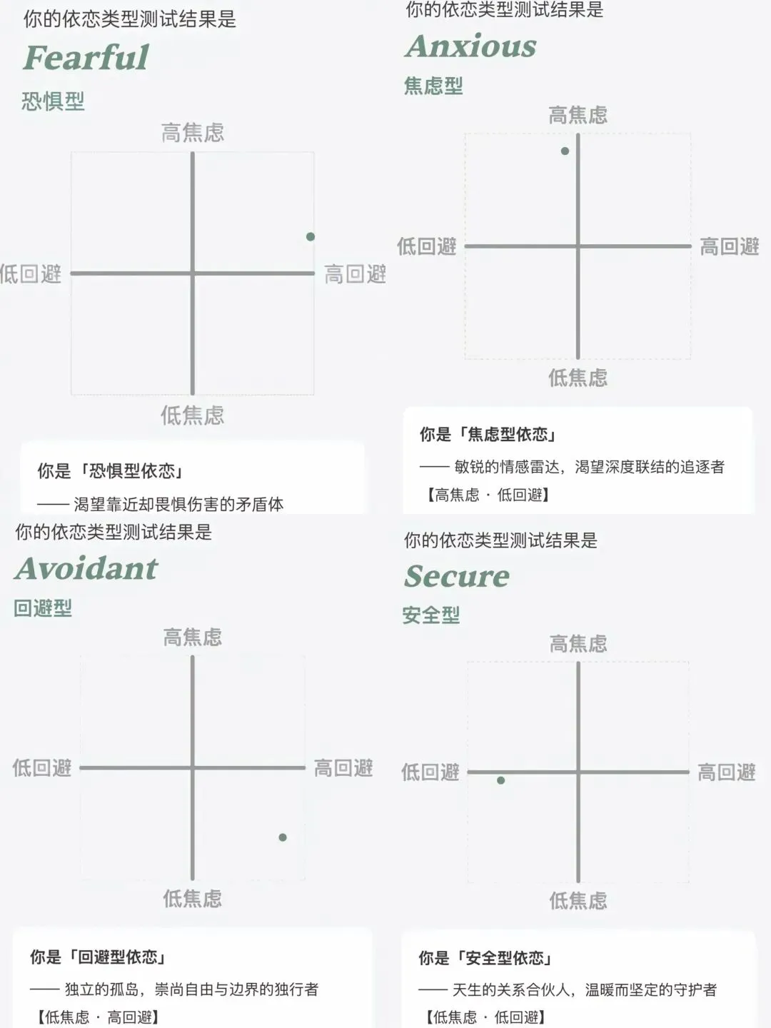 依恋类型源于心理学经典理论,决定了我们如何建立信任、表达需求、处理冲突。目前主流分为4类:安全型、焦虑型、回避型、恐惧型 。