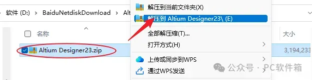 1.解压安装包:鼠标右击【Altium Designer 23】压缩包,选择电脑上安装的解压软件,点击【Altium Designer 23】。