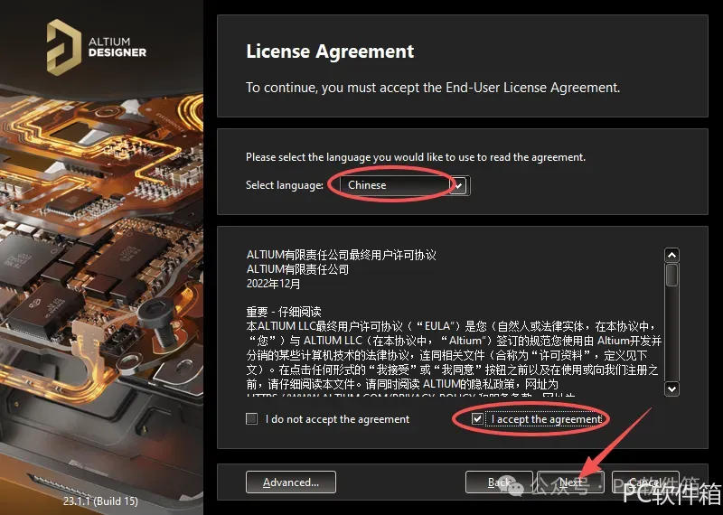 5.选择语言【Chinese】,勾选【I accept……】,点击【Next】。