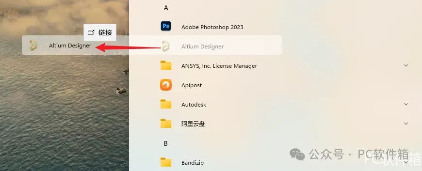 14.创建桌面快捷方式:①点击桌面任务栏中的【开始图标】>点击【所有应用】②将【Altium Designer】图标拖到电脑桌面。