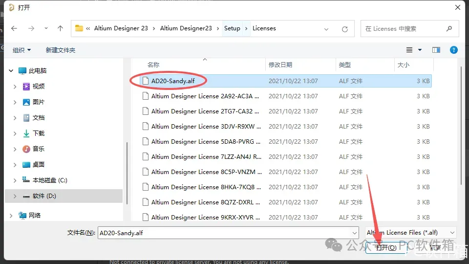 20.选择安装包解压后的【Altium Designer23】文件夹中【Setup】文件夹下的【Licenses】文件夹下的【AD20-Sandy.alf】文件,点击【打开】。
