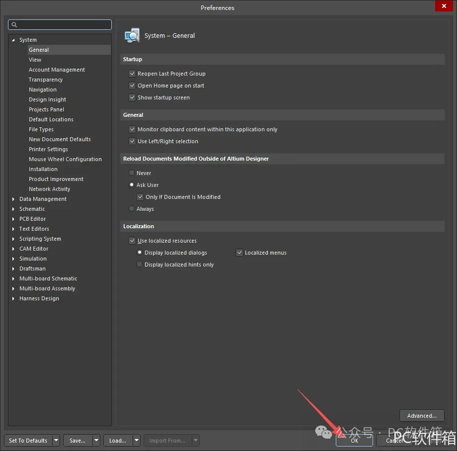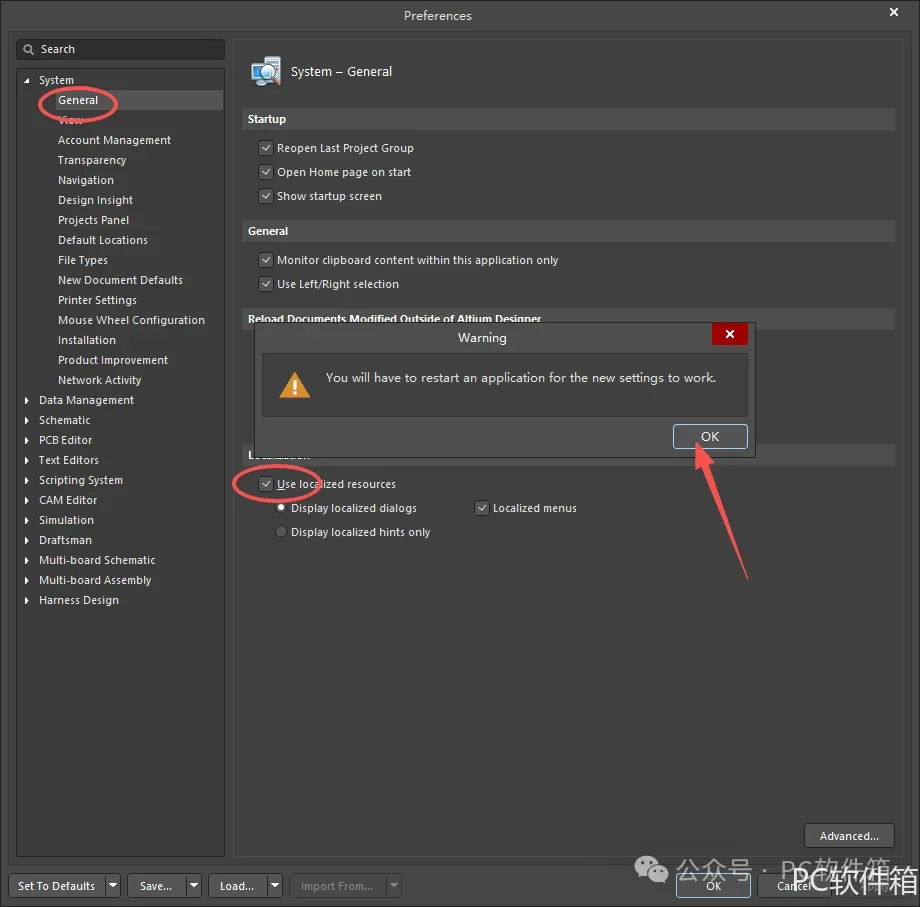 22.①点击【General】②勾选【Use localized resources】③点击【OK】。