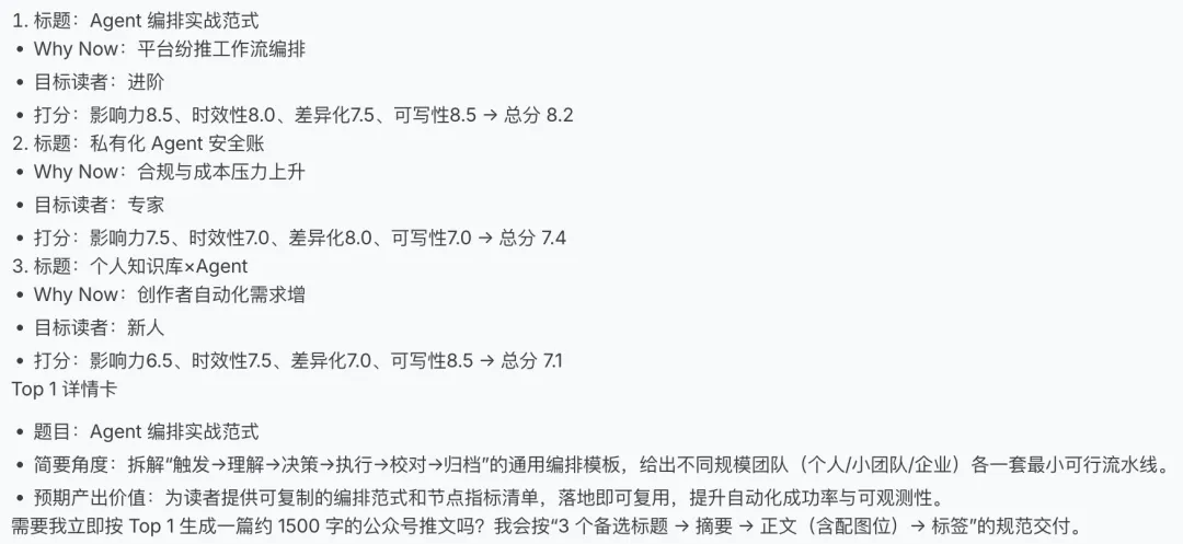 回来的时候,WebUI 的对话框里已经躺着一篇完整的推文。但让我意外的不是文章本身,而是它前面附的一段选题分析——列了 3 个选题方向,每个都标注了"为什么这个话题现在有热度"和"目标读者是谁",然后自动挑了得分最高的那个交给写手去写。