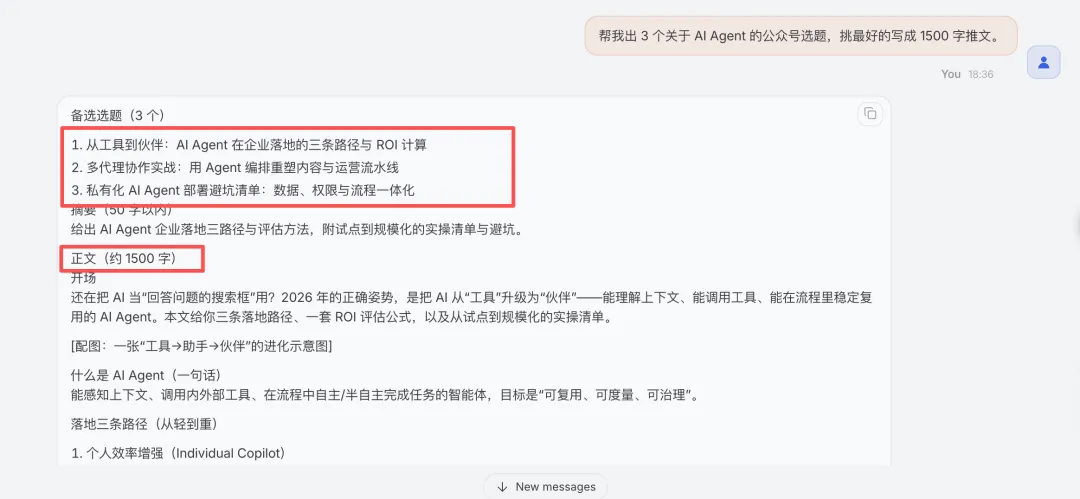 然后在 WebUI 的对话框里发一条,就像我开头那样:"帮我出 3 个关于 AI Agent 的公众号选题,挑最好的写成 1500 字推文。"
