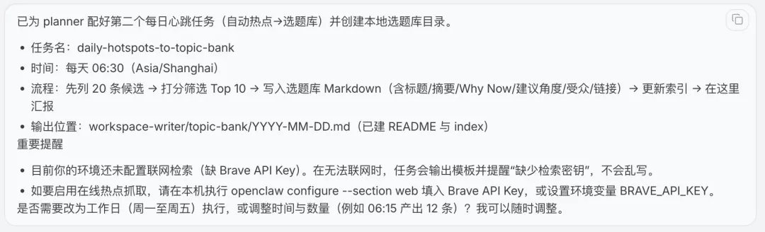 如果你跟着这篇文章已经跑起来了,接下来可以试试更多玩法:给 Planner 配上 heartbeat 让它每天自动积累选题库、给 Writer 加一个编辑 Agent 做交叉审稿、或者加一个配图 Agent 给成稿自动生成插画。OpenClaw 的多智能体玩法很多,而你已经迈出了最关键的第一步。
