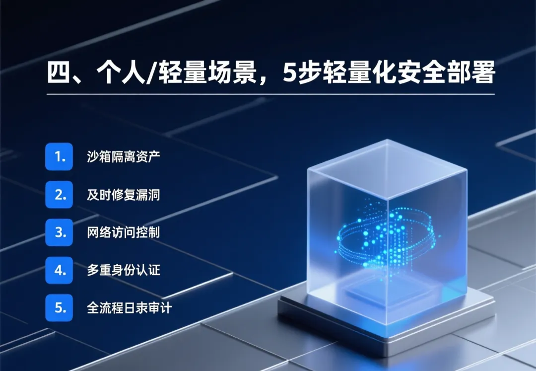对于个人用户或轻量办公场景,无需额外投入大量资源,做好以下5个基础配置,就能大幅降低使用风险,平衡效率与安全,操作简单易落地:- 缩小资产访问范围--用沙箱、容器等技术隔离敏感数据,严格限制OpenClaw可访问的文件与目录,坚决不让它接触核心隐私和重要工作文件;
