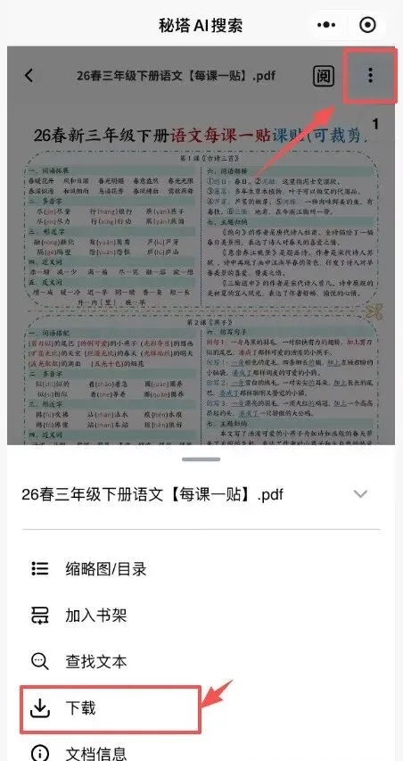 1、选择想要下载的资料,点击右上角三个圆点-下载