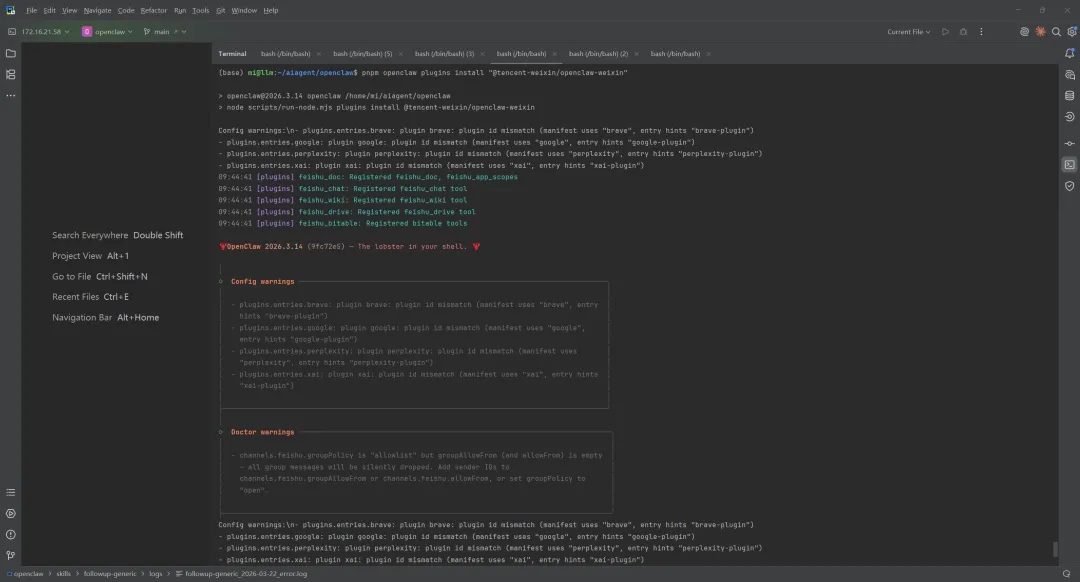 (base) mi@llm:~/aiagent/openclaw$ pnpm openclaw plugins install "@tencent-weixin/openclaw-weixin"> openclaw@2026.3.14 openclaw /home/mi/aiagent/openclaw> node scripts/run-node.mjs plugins install @tencent-weixin/openclaw-weixinConfig warnings:\n- plugins.entries.brave: plugin brave: plugin id mismatch (manifest uses "brave", entry hints "brave-plugin")- plugins.entries.google: plugin google: plugin id mismatch (manifest uses "google", entry hints "google-plugin")- plugins.entries.perplexity: plugin perplexity: plugin id mismatch (manifest uses "perplexity", entry hints "perplexity-plugin")- plugins.entries.xai: plugin xai: plugin id mismatch (manifest uses "xai", entry hints "xai-plugin")09:44:41 [plugins] feishu_doc: Registered feishu_doc, feishu_app_scopes09:44:41 [plugins] feishu_chat: Registered feishu_chat tool09:44:41 [plugins] feishu_wiki: Registered feishu_wiki tool09:44:41 [plugins] feishu_drive: Registered feishu_drive tool09:44:41 [plugins] feishu_bitable: Registered bitable tools🦞 OpenClaw 2026.3.14 (9fc72e5) — The lobster in your shell. 🦞│◇ Config warnings ─────────────────────────────────────────────────────────────────────────╮│ ││ - plugins.entries.brave: plugin brave: plugin id mismatch (manifest uses "brave", entry ││ hints "brave-plugin") ││ - plugins.entries.google: plugin google: plugin id mismatch (manifest uses "google", ││ entry hints "google-plugin") ││ - plugins.entries.perplexity: plugin perplexity: plugin id mismatch (manifest uses ││ "perplexity", entry hints "perplexity-plugin") ││ - plugins.entries.xai: plugin xai: plugin id mismatch (manifest uses "xai", entry hints ││ "xai-plugin") ││ │├───────────────────────────────────────────────────────────────────────────────────────────╯│◇ Doctor warnings ──────────────────────────────────────────────────────────────────────────╮│ ││ - channels.feishu.groupPolicy is "allowlist" but groupAllowFrom (and allowFrom) is empty ││ — all group messages will be silently dropped. Add sender IDs to ││ channels.feishu.groupAllowFrom or channels.feishu.allowFrom, or set groupPolicy to ││ "open". ││ │├────────────────────────────────────────────────────────────────────────────────────────────╯Config warnings:\n- plugins.entries.brave: plugin brave: plugin id mismatch (manifest uses "brave", entry hints "brave-plugin")- plugins.entries.google: plugin google: plugin id mismatch (manifest uses "google", entry hints "google-plugin")- plugins.entries.perplexity: plugin perplexity: plugin id mismatch (manifest uses "perplexity", entry hints "perplexity-plugin")- plugins.entries.xai: plugin xai: plugin id mismatch (manifest uses "xai", entry hints "xai-plugin")Downloading @tencent-weixin/openclaw-weixin…Extracting /tmp/openclaw-npm-pack-kBSYCu/tencent-weixin-openclaw-weixin-1.0.2.tgz…Plugin manifest id "openclaw-weixin" differs from npm package name "@tencent-weixin/openclaw-weixin"; using manifest id as the config key.WARNING: Plugin "openclaw-weixin" contains dangerous code patterns: Environment variable access combined with network send — possible credential harvesting (/tmp/openclaw-plugin-8x6q3H/extract/package/src/messaging/process-message.ts:432) Installing to /home/mi/.openclaw/extensions/openclaw-weixin…Installing plugin dependencies…09:45:08 [plugins] plugins.allow is empty; discovered non-bundled plugins may auto-load: openclaw-weixin (/home/mi/.openclaw/extensions/openclaw-weixin/index.ts). Set plugins.allow to explicit trusted ids. 09:45:08 [plugins] feishu_doc: Registered feishu_doc, feishu_app_scopes09:45:08 [plugins] feishu_chat: Registered feishu_chat tool09:45:08 [plugins] feishu_wiki: Registered feishu_wiki tool09:45:08 [plugins] feishu_drive: Registered feishu_drive tool09:45:08 [plugins] feishu_bitable: Registered bitable toolsConfig warnings:- plugins.entries.brave: plugin brave: plugin id mismatch (manifest uses "brave", entry hints "brave-plugin")- plugins.entries.google: plugin google: plugin id mismatch (manifest uses "google", entry hints "google-plugin")- plugins.entries.perplexity: plugin perplexity: plugin id mismatch (manifest uses "perplexity", entry hints "perplexity-plugin")- plugins.entries.xai: plugin xai: plugin id mismatch (manifest uses "xai", entry hints "xai-plugin")Config overwrite: /home/mi/.openclaw/openclaw.json (sha256 5cac0ea63e73cdd19e03eddf8d04df99aae73c219f9473ac3ec5024737164cb1 -> b312e29d8ed7c6aaa5e987eaa0ba45135ff5431bfd7df237585d8cccc460a2c0, backup=/home/mi/.openclaw/openclaw.json.bak)Installed plugin: openclaw-weixinRestart the gateway to load plugins.二.安装插件执行流程