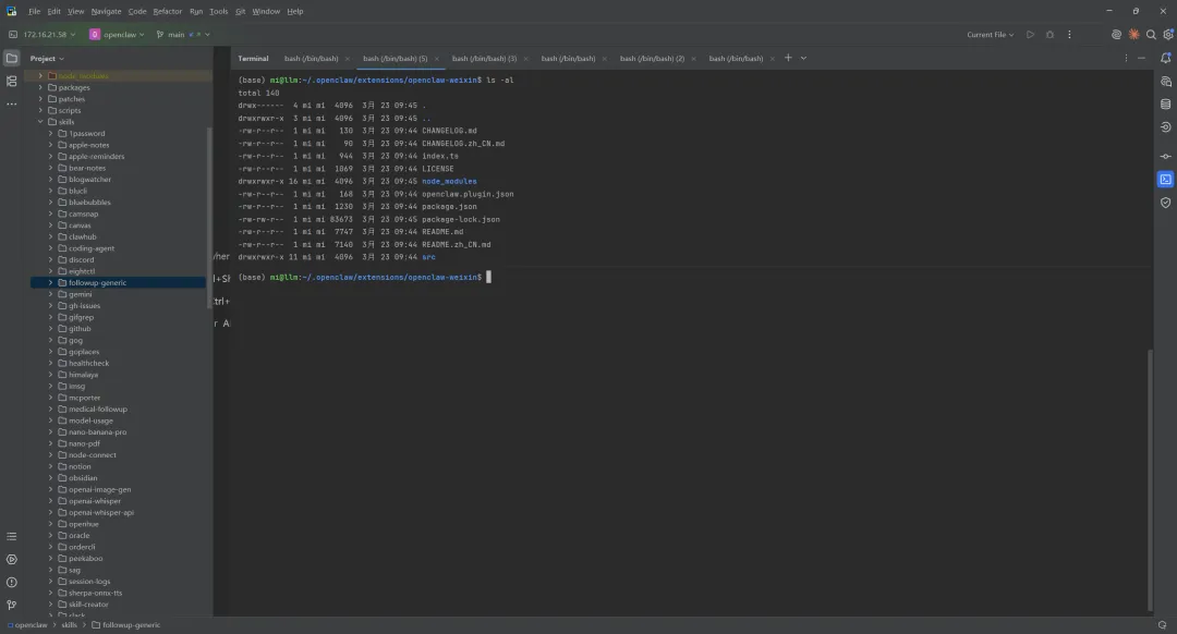 /home/mi/.openclaw/extensions/openclaw-weixin/。安装依赖:进入插件目录,安装其自身的 npm 依赖项,确保插件运行环境完整。