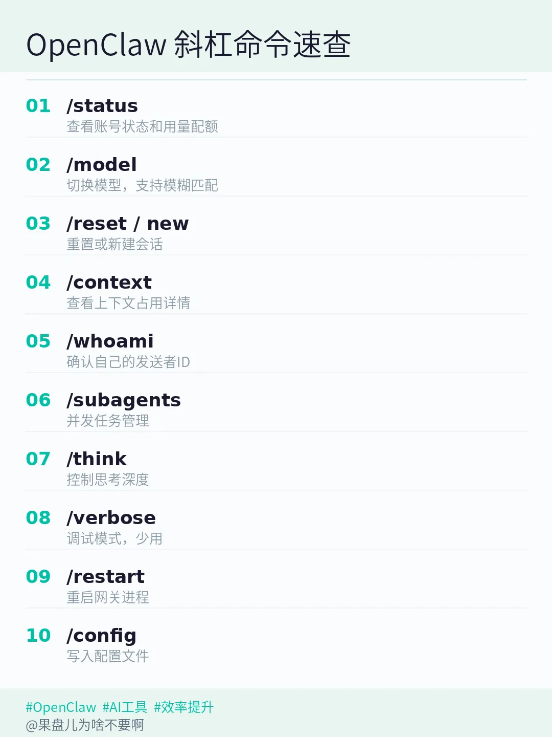 多平台接入的时候,你从 微信发的和从飞书发的,身份标识不一样。这个命令让你看清楚自己的 ID。