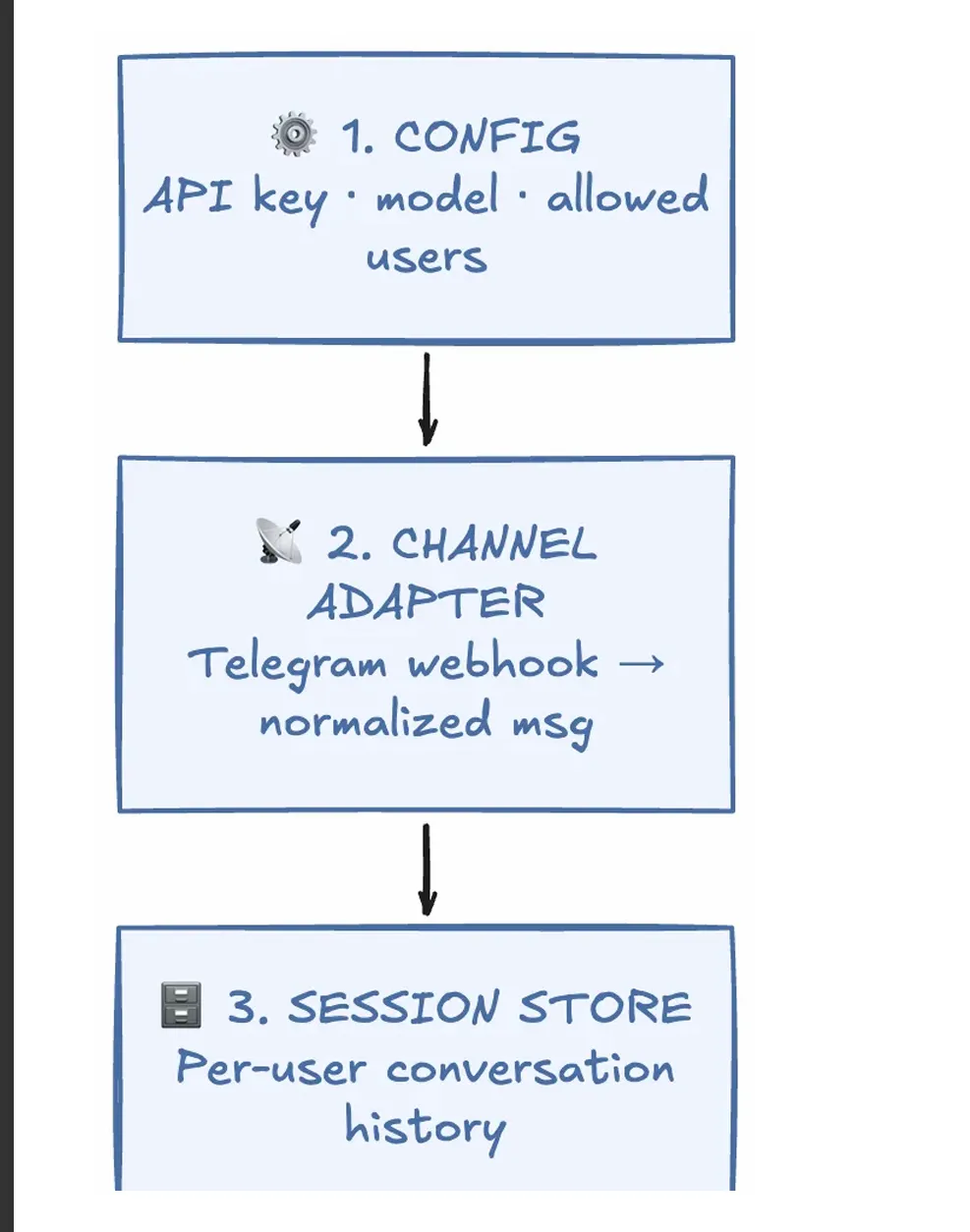 但 Config Loader 做的是一件非常重要的事:它定义了整个 Agent 运行时的边界条件——用哪个模型、连什么地址、允许哪些工具、工具超时多久、会话历史存哪里、最大循环几次。