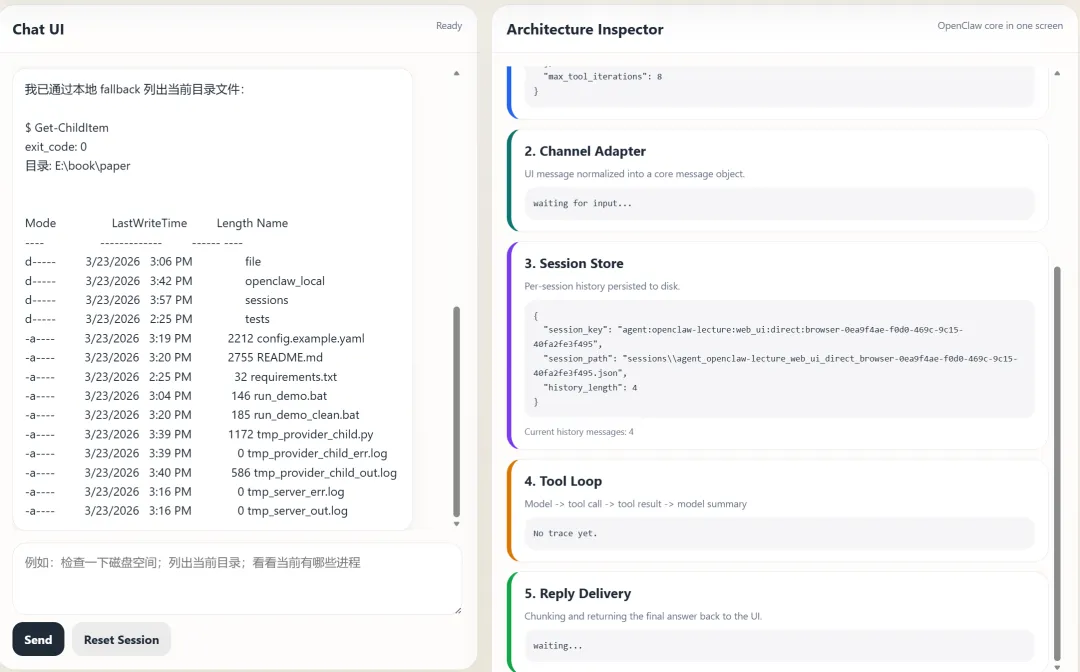 真实的 OpenClaw 允许模型多轮循环调用工具,但在本地小模型 + 课堂演示场景下,无限自由迭代最容易出现重复调用、跑偏、上下文漂移。所以项目做了一个务实的工程取舍:保留完整的循环结构,但在第一轮工具执行后,用 _force_final_answer() 强制模型产出总结: