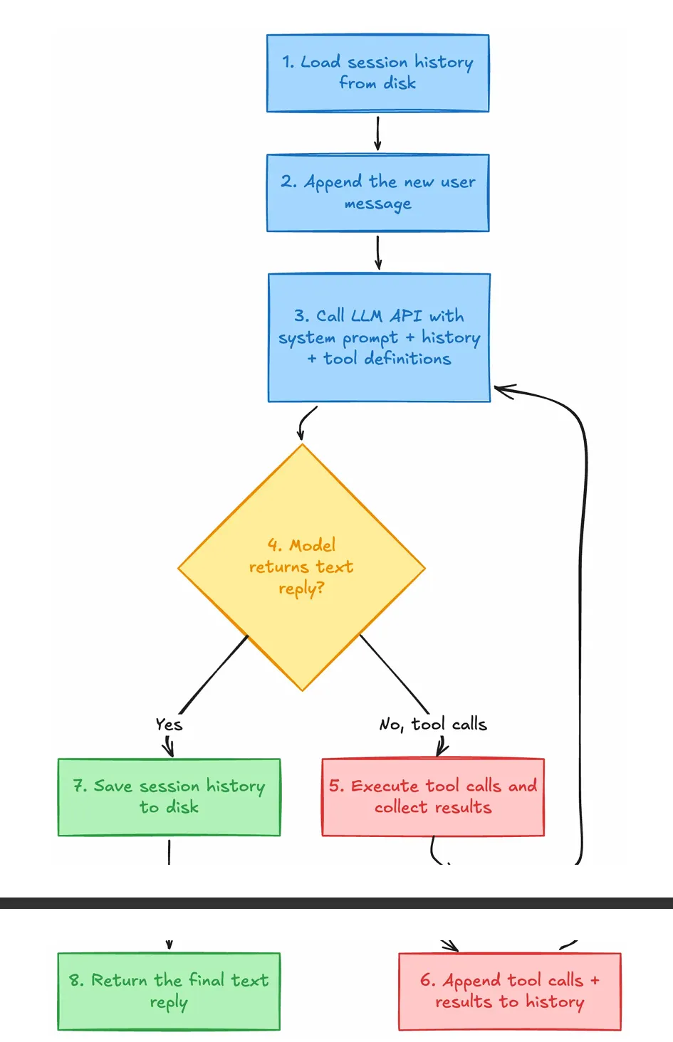 ounter(lineounter(lineounter(lineounter(lineounter(lineounter(linelock = self.session_store.get_lock(session_key)with lock:history_before = self.session_store.load_messages(session_key)history = [*history_before, {"role": "user", "content": message.text}]updated_history, final_text, trace = await self.tool_loop.run(history)self.session_store.save_messages(session_key, updated_history)