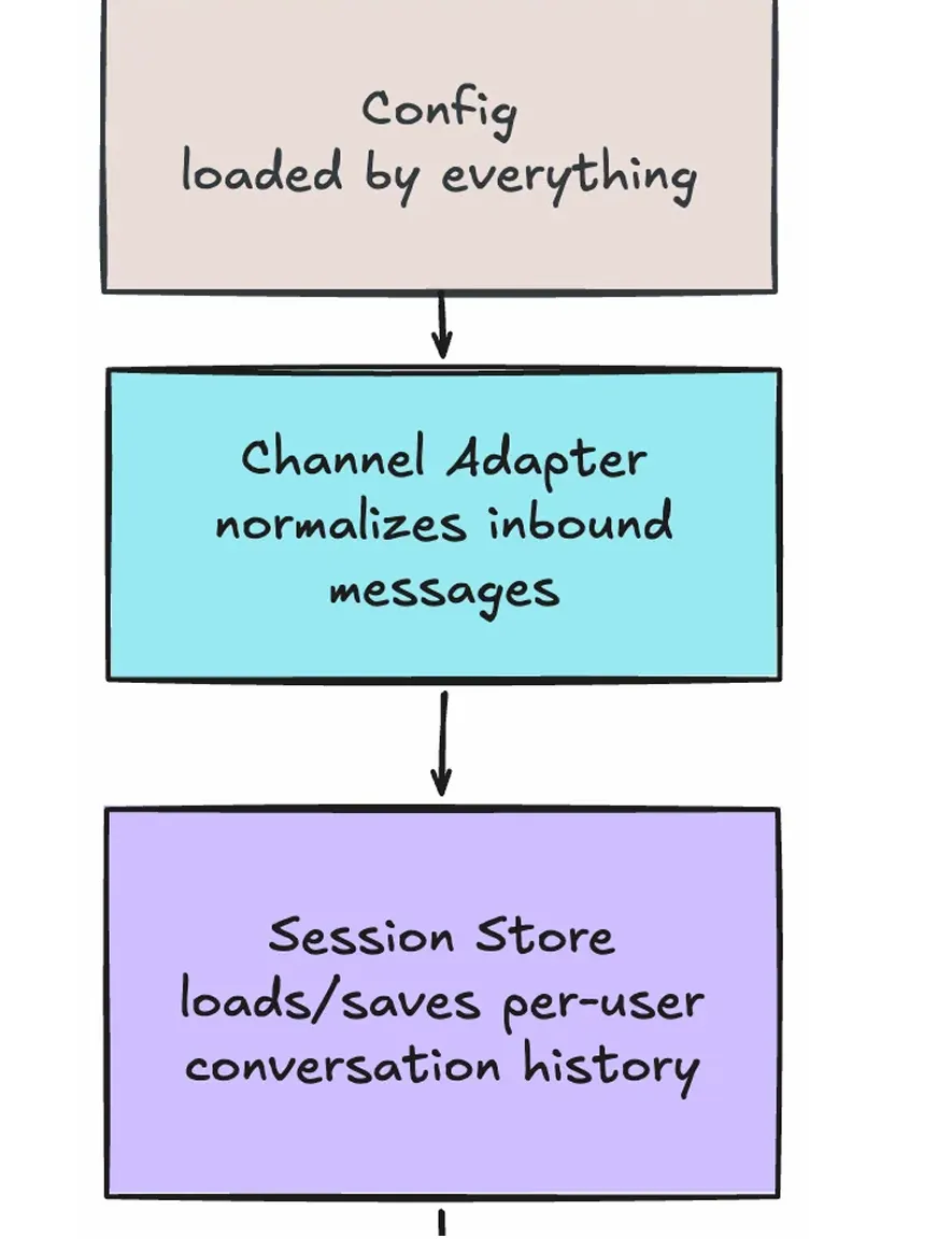 现实世界的消息入口极其"脏":Telegram 的 webhook payload、飞书的事件回调、钉钉的机器人消息体、Discord 的 Gateway 事件——格式完全不同。如果让核心逻辑直接面对这些平台原始格式,系统会迅速变成一团糟。