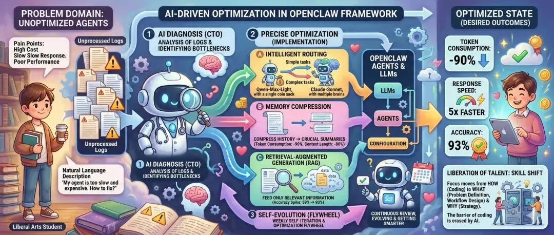 02. 揭秘:文科生如何“空手套白狼”优化AI?别被“优化”二字吓到。对于OpenClaw这类新一代AI智能体框架,优化的核心并非改代码,而是策略和配置。而这,完全可以通过对话完成。
