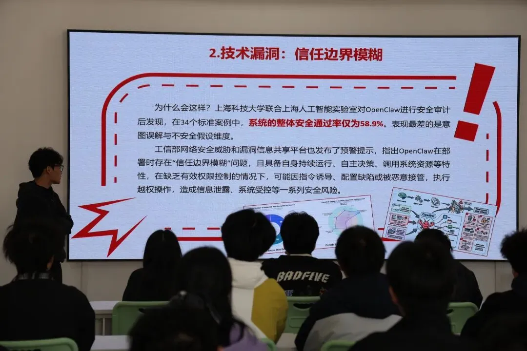 在交流会上,主讲人于岭同学从技术、社会、心理、社区生态四个层面,深入剖析了 “龙虾热” 的成因。他表示,该热潮既是人工智能实现从 “动嘴” 到 “动手” 的关键突破,也反映出当下全民兼具 AI 焦虑与主动学习的双重心态。同时,他结合真实案例,提醒大家警惕 OpenClaw 技术存在的误删数据、隐私泄露、成本失控等安全风险,指出其安全审计通过率仅 58.9%,并提及工信部已发布相关专项预警,为在场师生敲响安全警钟。在互动交流环节,同学们纷纷表示受益匪浅。