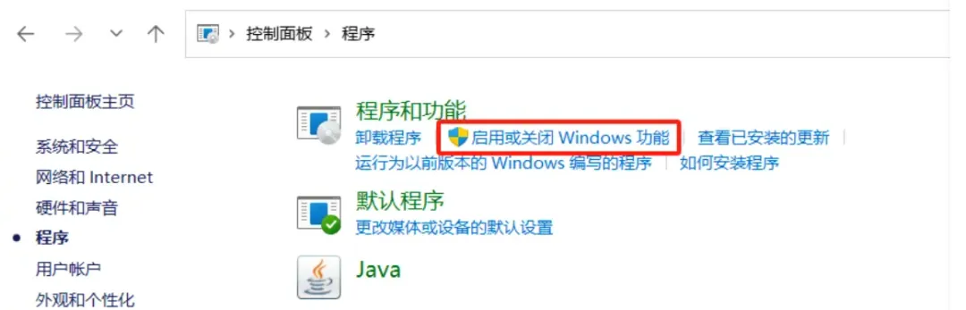 控制面板 -> 程序 -> 启用或关闭Windows功能