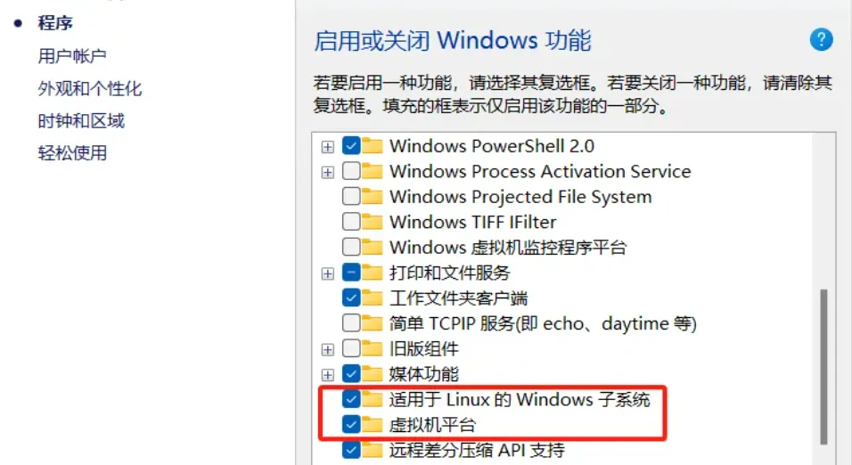 (2)勾选"Virtual Machine Platform" 、"适用于Linux的Windows子系统"