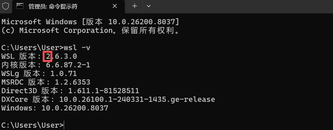 如果wsl不是版本2,则升级一下:wsl --update