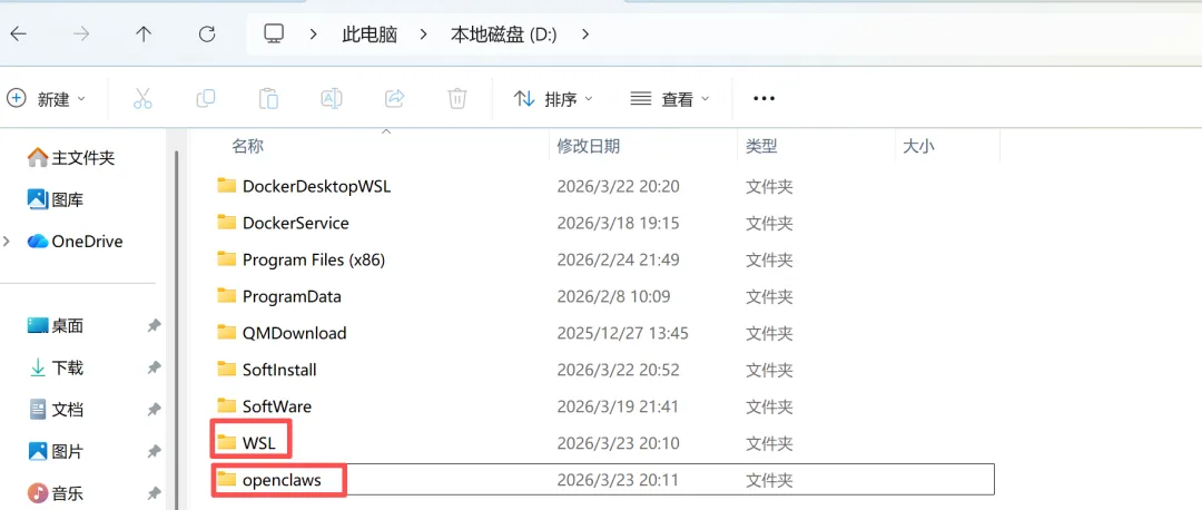 在D盘中创建WSL和openclaws,并将下载好的镜像文件解压在openclaws目录中