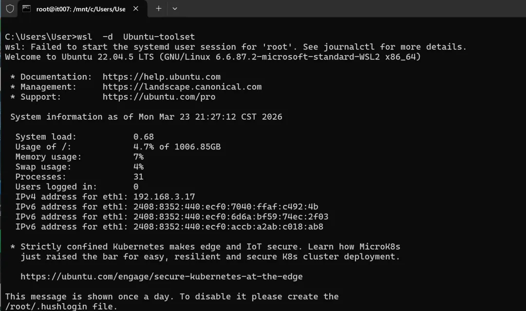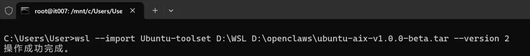 wsl --import Ubuntu-toolset D:\WSL D:\openclaws\ubuntu-aix-v1.0.0-beta.tar --version 2