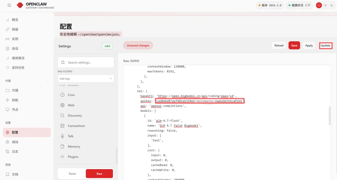 修改一下智谱模型的apikey,记得点击update