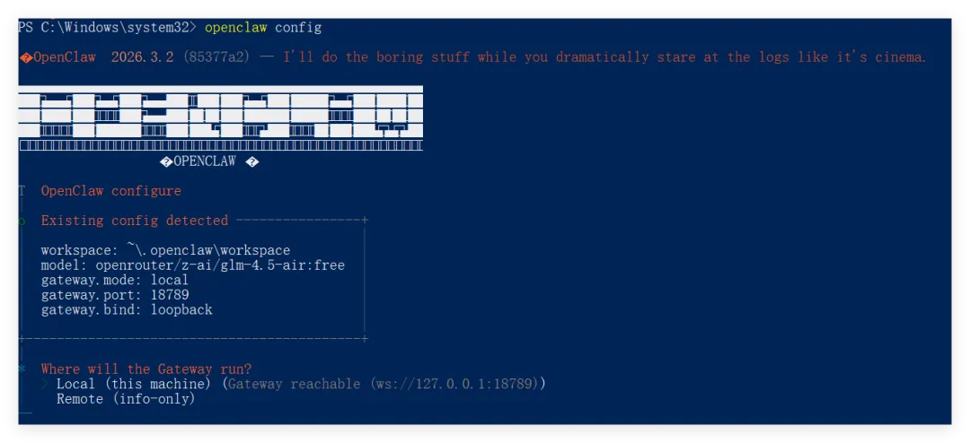 在Windows (PowerShell)(管理员)命令行工具中输入openclaw config,如下,直接回车。