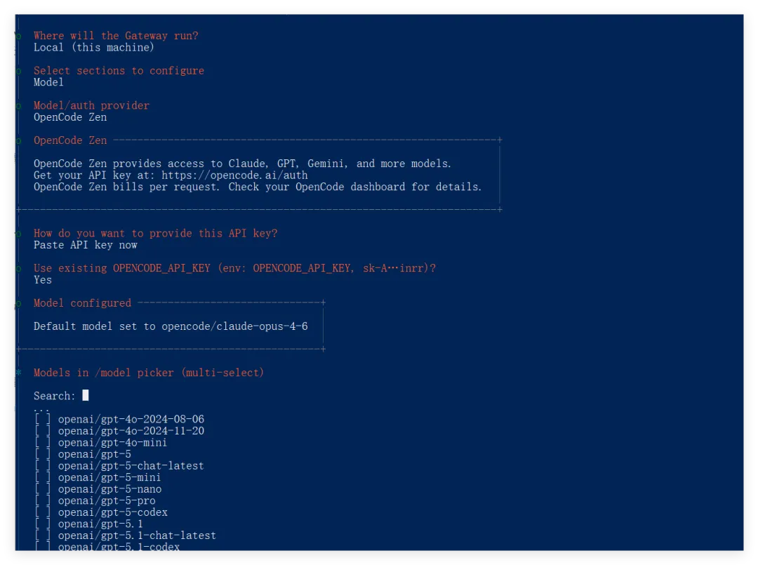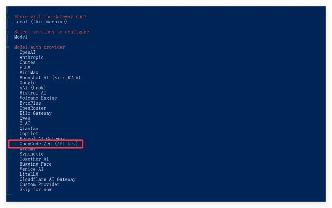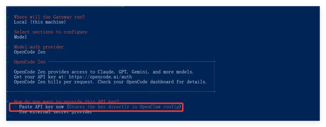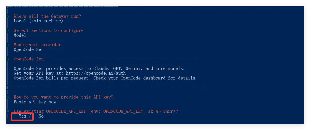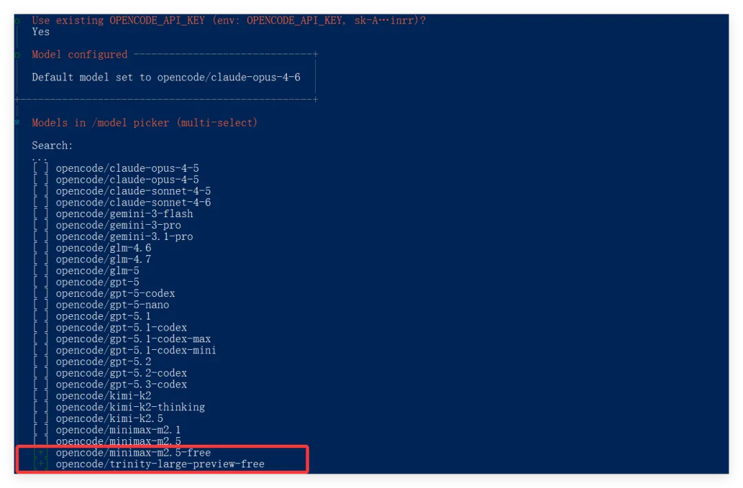 注意,如果没有注册,先去https://opencode.ai/zen注册一个账号,并获取API Key,目前提供两个免费模型minimax-m2.5-free和trinity-large-preview-free。由于我已经设置在环境变量中配置了API Key,提示选择环境变量,如果你没有设置过就直接粘贴获得的API Key,然后回车。