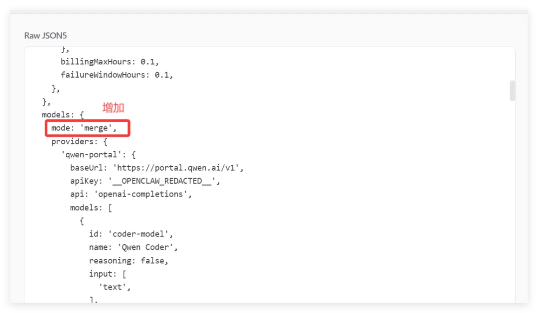 增加mode: 'merge',控制多模型配置,注意,这里是个坑,必须设置。