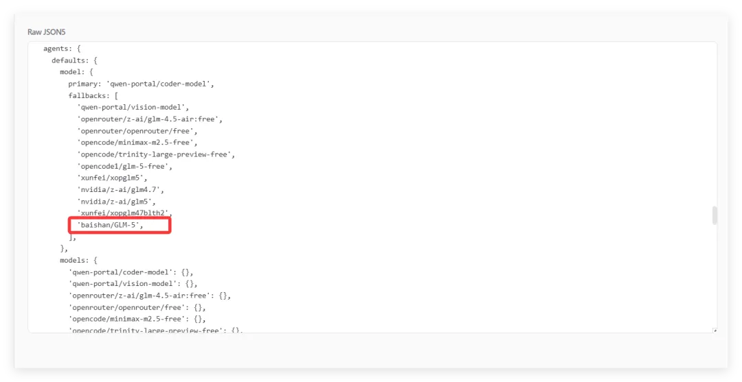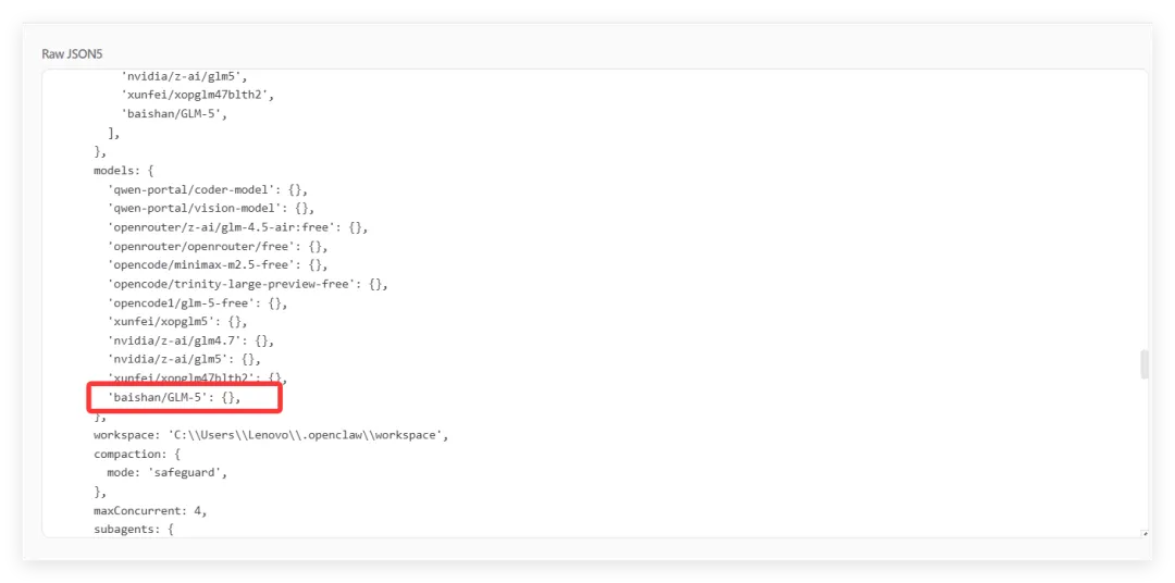 {#............//认证配置,包含不同提供者的认证信息"auth": {"profiles": {"qwen-portal:default": {"provider": "qwen-portal","mode": "oauth"}}},//模型配置,定义了可用的AI模型及其参数"models": {"providers": {"qwen-portal": {"baseUrl": "https://portal.qwen.ai/v1","apiKey": "qwen-oauth","api": "openai-completions","models": [{"id": "coder-model","name": "Qwen Coder","reasoning": false,"input": ["text"],"cost": {"input": 0,"output": 0,"cacheRead": 0,"cacheWrite": 0},"contextWindow": 128000,"maxTokens": 8192},{"id": "vision-model","name": "Qwen Vision","reasoning": false,"input": ["text","image"],"cost": {"input": 0,"output": 0,"cacheRead": 0,"cacheWrite": 0},"contextWindow": 128000,"maxTokens": 8192}]}}},//代理配置,设置默认使用的模型和工作参数"agents": {"defaults": {"model": {"primary": "qwen-portal/coder-model","fallbacks": ["qwen-portal/coder-model","qwen-portal/vision-model"]},"models": {"qwen-portal/coder-model": {"alias": "qwencode"},"qwen-portal/vision-model": {"alias": "qwenvision"}},"workspace": "C:\\Users\\Lenovo\\.openclaw\\workspace","compaction": {"mode": "safeguard"},"maxConcurrent": 4,"subagents": {"maxConcurrent": 8}}},#............}