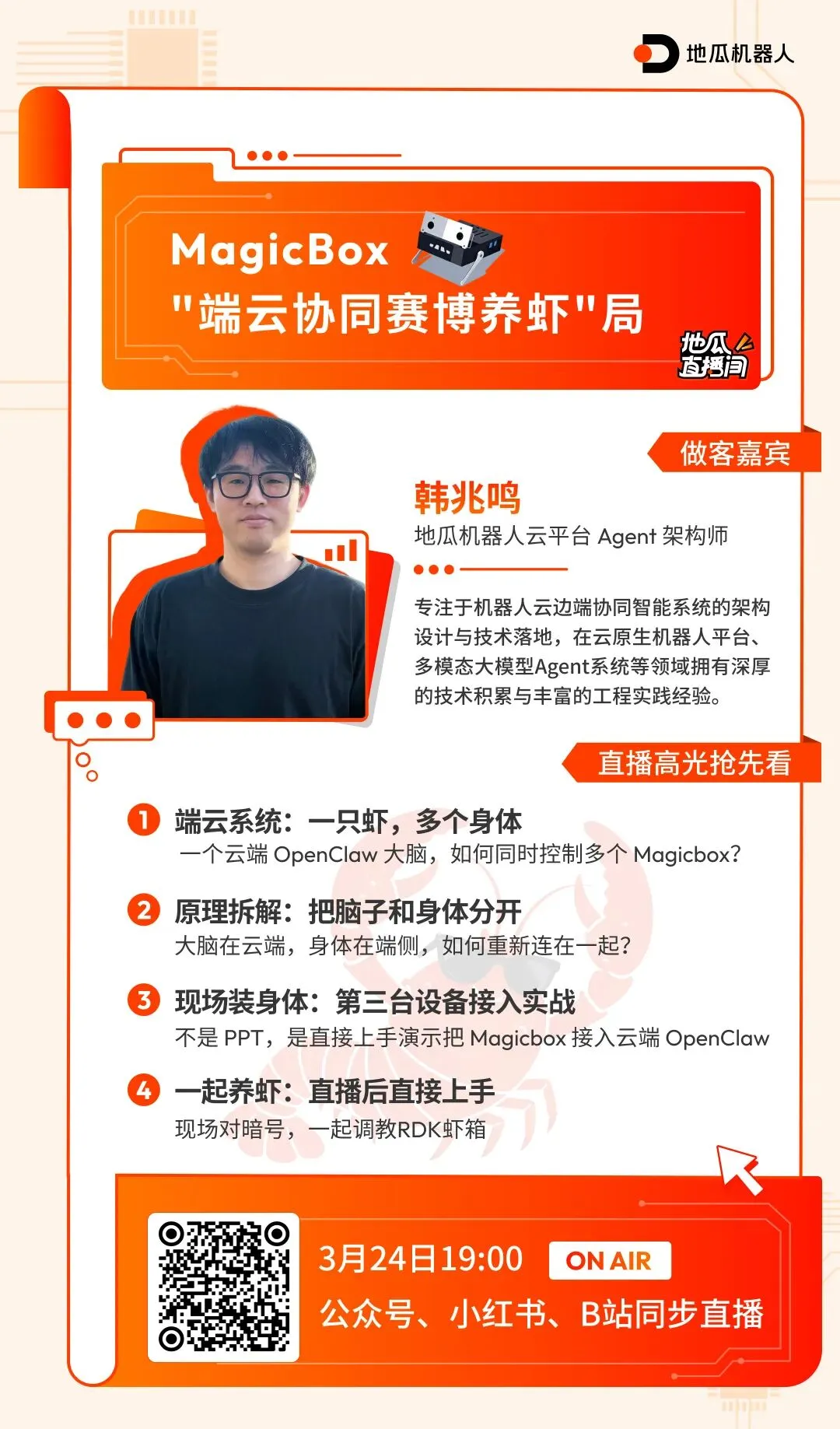 3月24日晚7点,地瓜机器人云平台Agent架构师韩兆鸣把“OpenClaw端云协同”拆开、装好、运行——