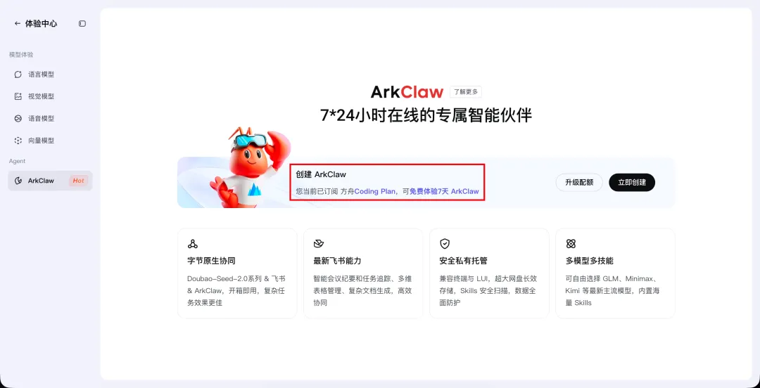 顺便提一下 ArkClaw。开通 Lite Plan 后即可直接使用,相比火山引擎一键部署更加偏向产品化。