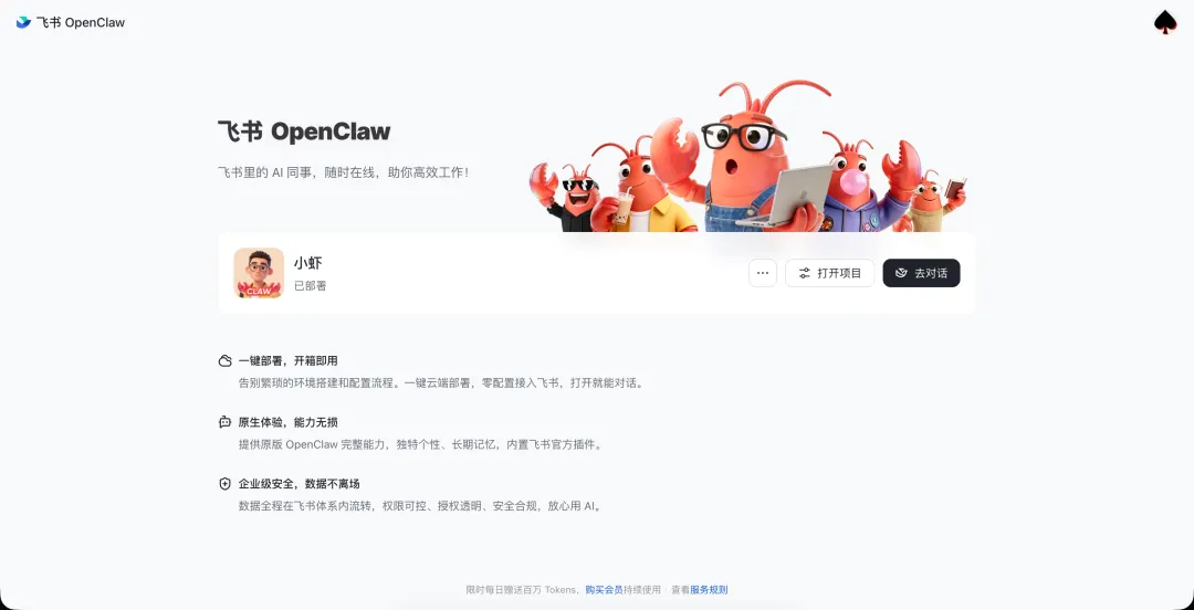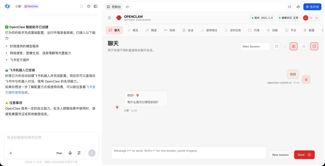 真正意义上的一键搭建。后端运行在飞书妙搭中,并自动对接飞书会话,是目前体验 OpenClaw 最简单的方式之一。