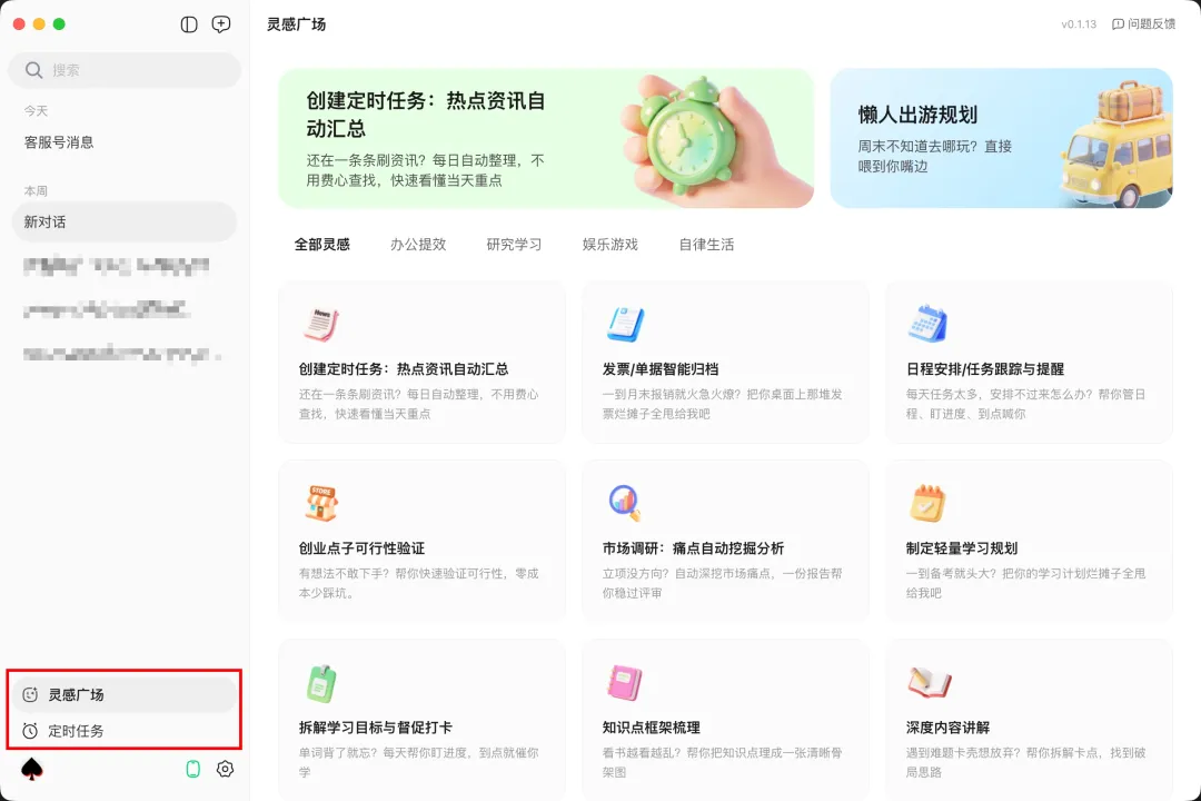 另外产品还提供灵感广场和定时任务界面,灵感广场中提供了一些预设好的任务模板,便于快速体验。