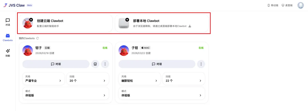 JVS Claw 支持本地和云端两种部署模式,客户端有 Web 端、桌面端和移动端,三端齐全,完成度非常高。