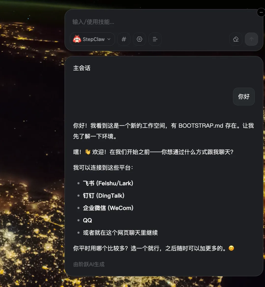 StepClaw 最大的特点是没有把 OpenClaw 做成一个重型 APP,而是通过悬浮快捷键一键唤醒输入框。