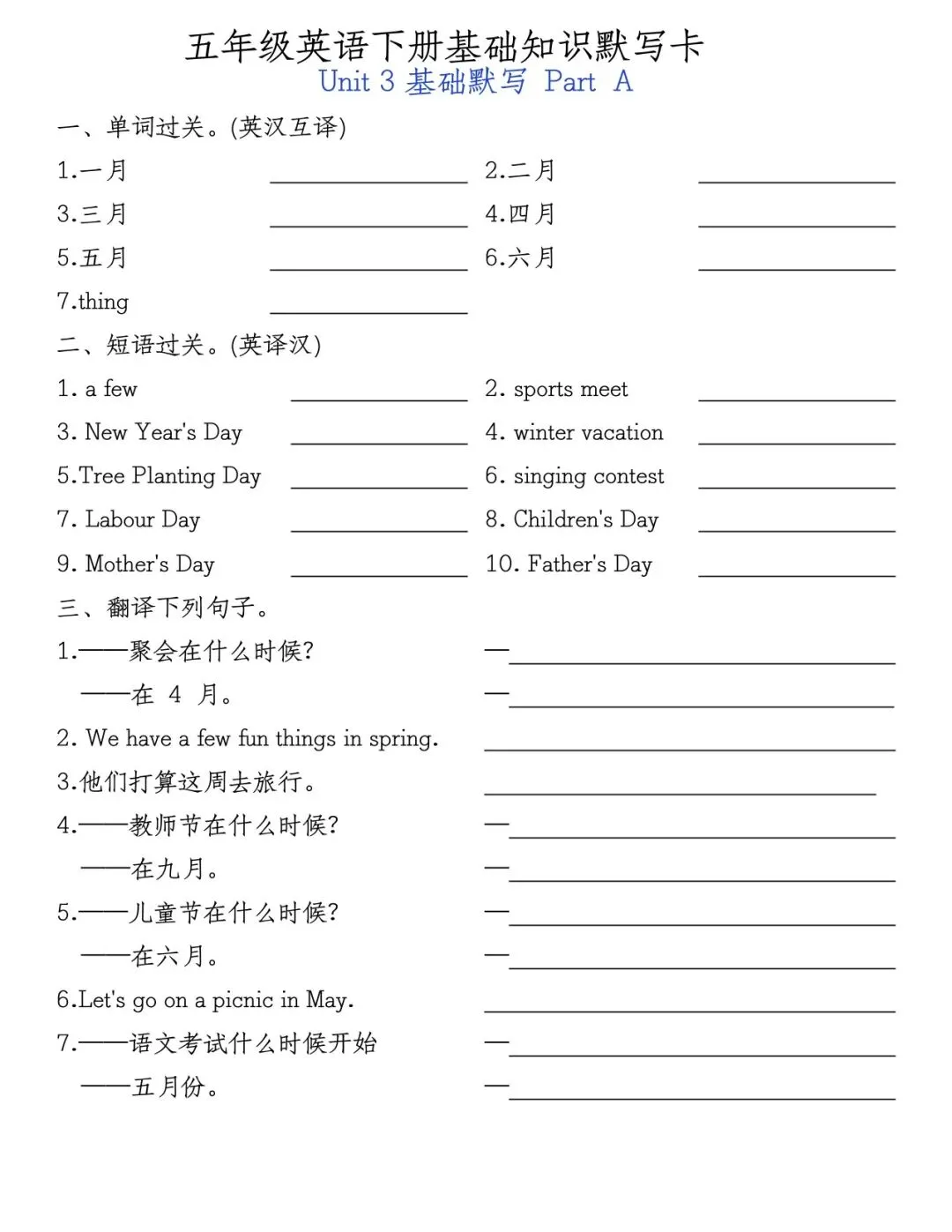 本默写卡同步人教PEP五年级下册英语教材,专为五年级学生英语基础巩固、单元复习、期中期末备考设计,聚焦全册核心单词、短语、句型、基础语法四大模块,采用便携卡片式排版,可裁剪拆分使用,主打默写自测、家长听写、课堂抽查,一站式夯实英语基础,攻克默写易错点,是日常学习与考前速记的必备基础资料。