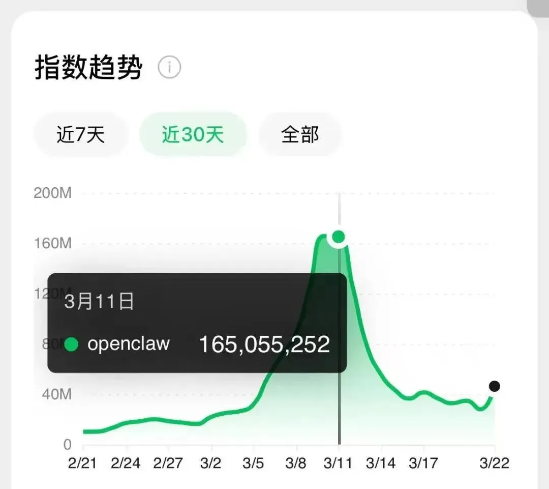 3 月 11 号,微信指数单日冲到了 1.6 亿。十天过去,虽然回落到 4000 万左右,但这个数字依然炸裂——要知道半个月前它还只有 2000 万。