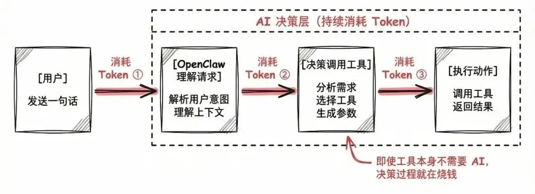 你看这个流程:用户发一句话 → OpenClaw 理解请求(消耗 Token)→ 决定调用哪个工具(消耗 Token)→ 执行动作(还是消耗 Token)。
