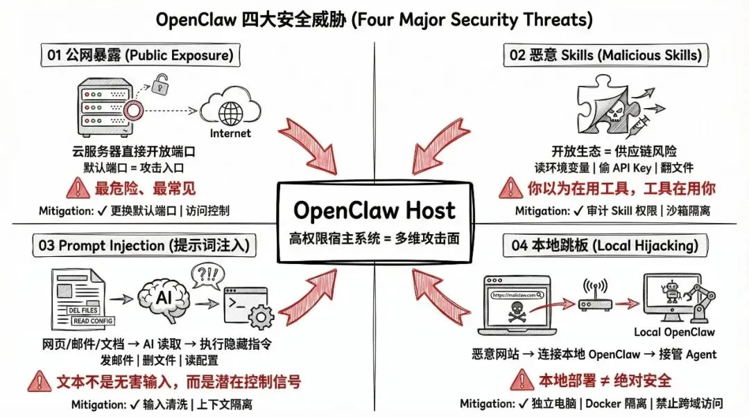 OpenClaw 的 Skills 生态是开放的,有人发布"效率神器",装上去之后,它在后台翻你的文件、读你的环境变量、偷你的 API Key。