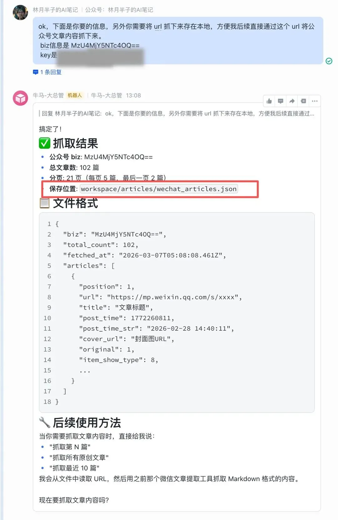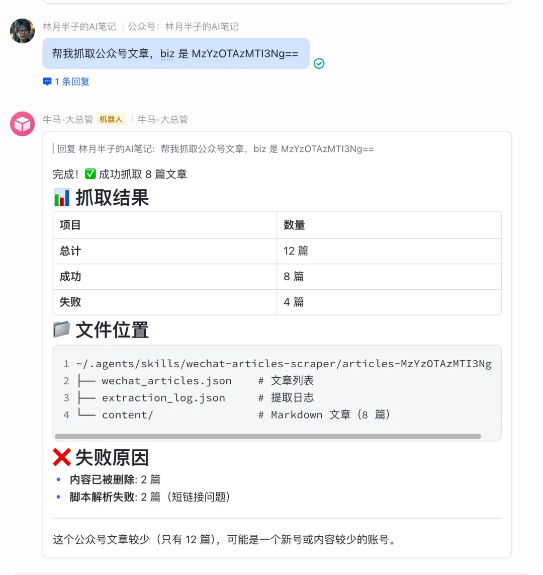 流程跑通之后,我直接用自然语言告诉它:把刚才这个完整流程,封装成一个 Skill。以后我只要给它一个 biz 信息,它就自动把这个公众号所有文章全部下载下来。