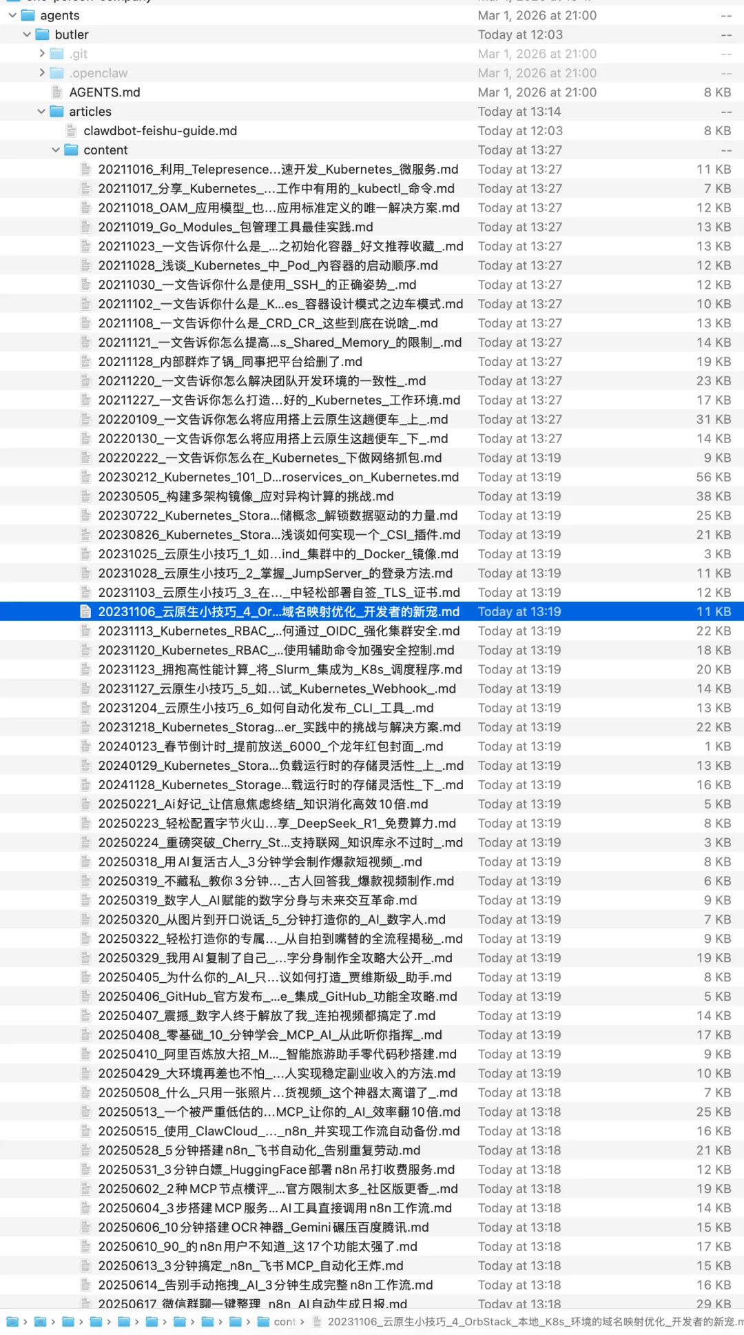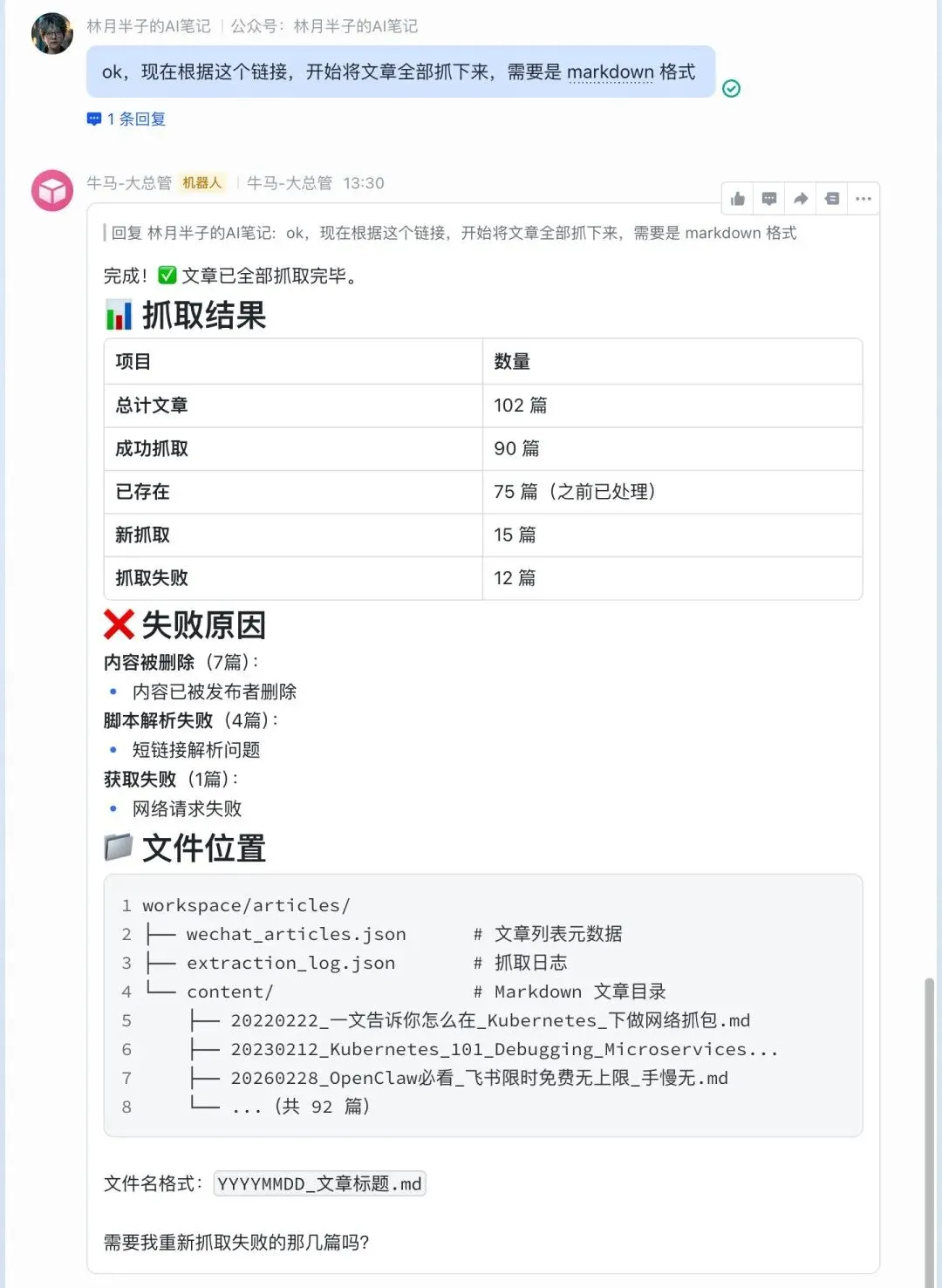 只告诉它 biz 信息,它自己就跑完了整个流程,文章全部下载到本地。