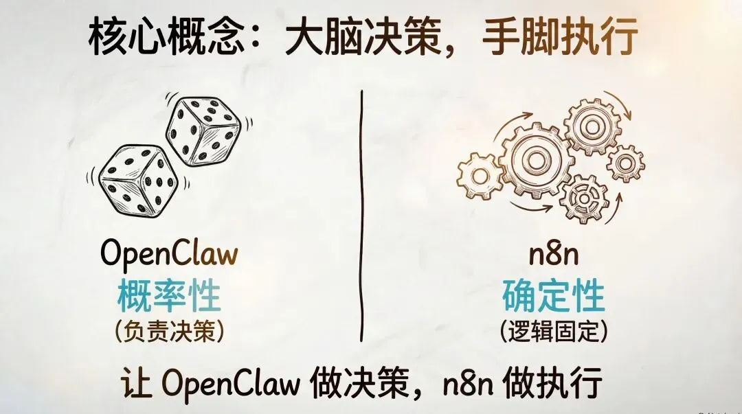 让 OpenClaw 只负责概率性的事情,也就是思考和决策;让 n8n 负责确定性的事情,也就是执行。