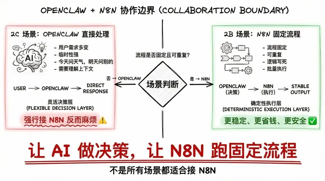 2C 场景(用户需求多变、临时性强,今天问天气明天问别的):直接让 OpenClaw 处理就好,强行接 n8n 反而麻烦。