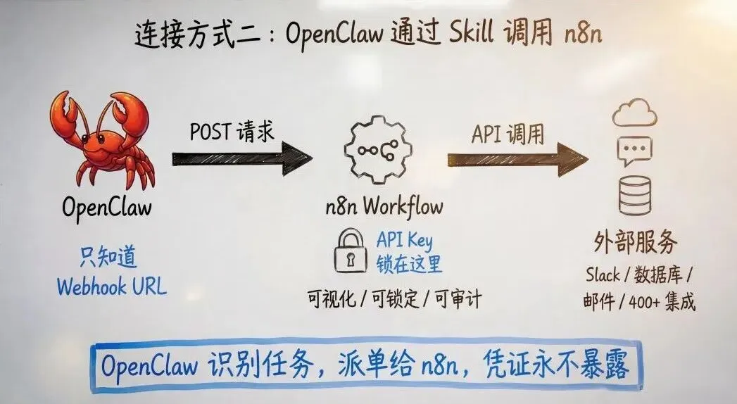 怎么做?把 n8n 的 Webhook URL 封装成一个 Skill,注册到 OpenClaw 里。