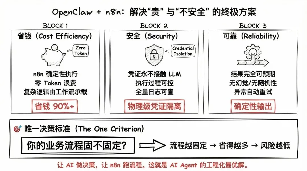 2B 场景(流程固定、可重复、逻辑写死):这种放在 n8n 里更稳定、更省钱、更安全,才是 OpenClaw + n8n 最发挥价值的地方。