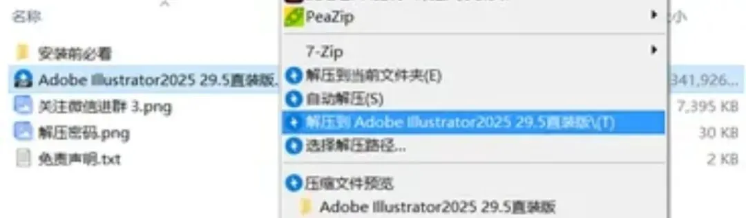 🔹打开下载好的文件夹,找到压缩包,鼠标右键选择【解压到Adobe Illustrator2025 29.5直装版\】